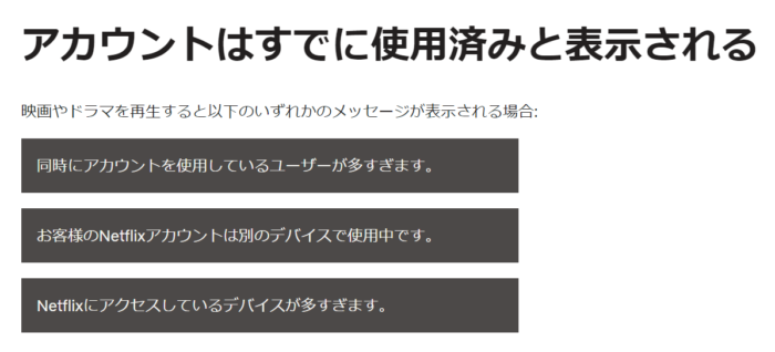 「申し訳ありません。お客様のアカウントで同時に視聴しているユーザー数が多すぎます」   引用元:Netflixより