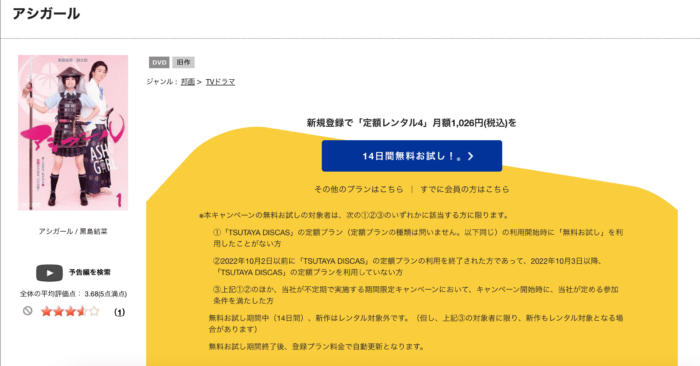 TSUTAYA DISCASは、TSUTAYAが提供するCD・DVD宅配レンタルサービスです。TSUTAYA DISCASも無料お試し期間があり、ドラマ『アシガール』を無料でレンタルして視聴できます。月に4枚までのプランは14日間、月に8枚までのプランは30日間無料でレンタル可能です。