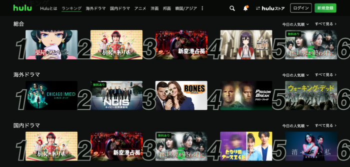 Huluではログインせずに、視聴できる作品のラインナップを確認できます。Huluのホームページにアクセスすると、ログイン後と同じように作品を検索する機能が試せるんです!