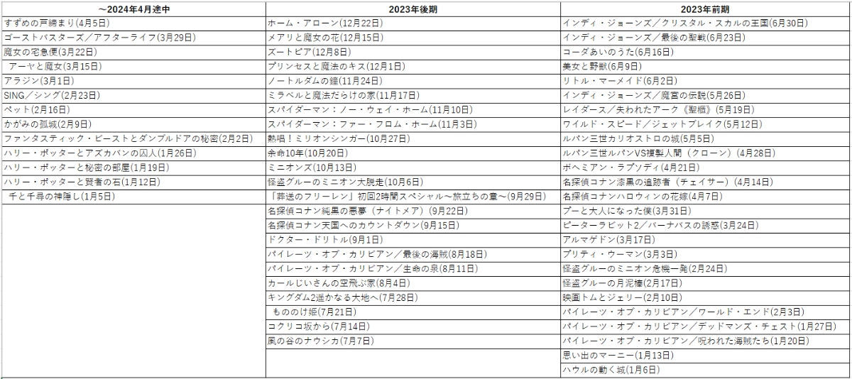 過去に放送されたバックナンバーについては公式ページに記載がありませんが、2023年から2024年4月途中までの金曜ロードショーの放送リストはこちらです。