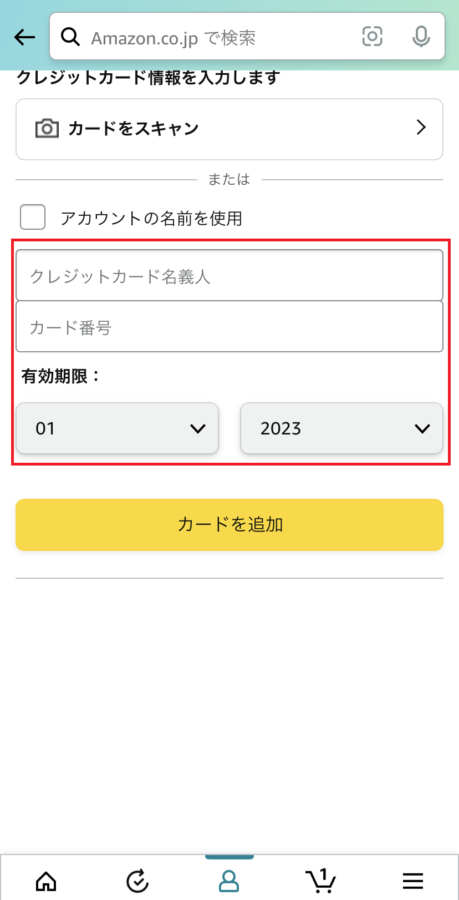 - .赤枠に必要事項を入力後、「カードを追加」をクリック