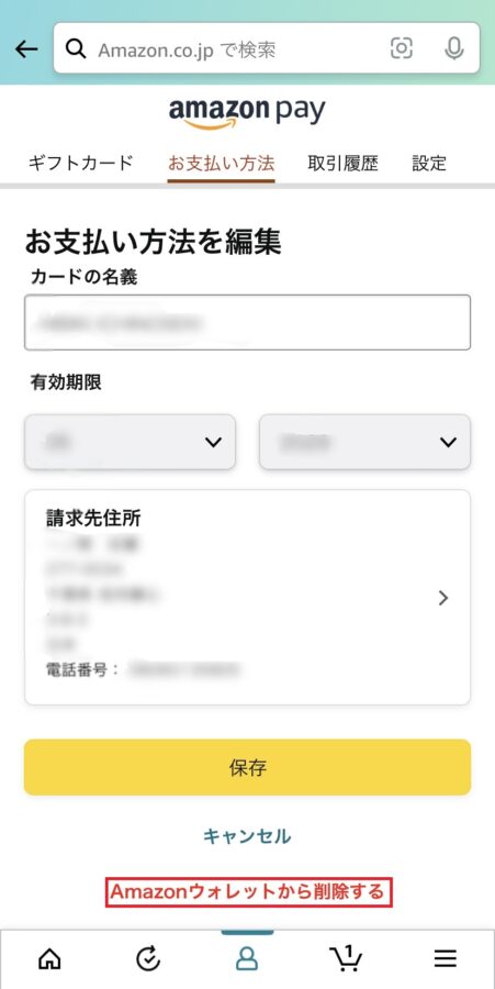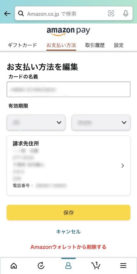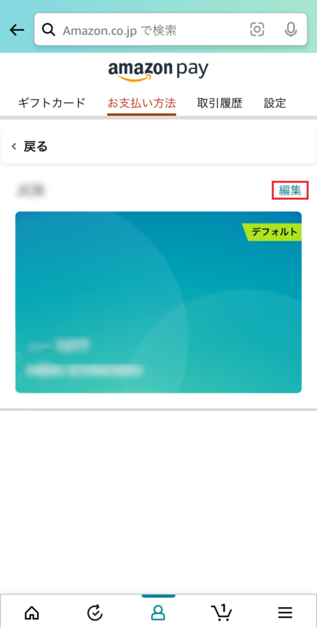 - 登録している支払い情報が出てくるので、変更または削除したい情報をクリック